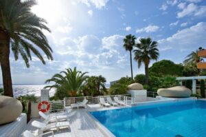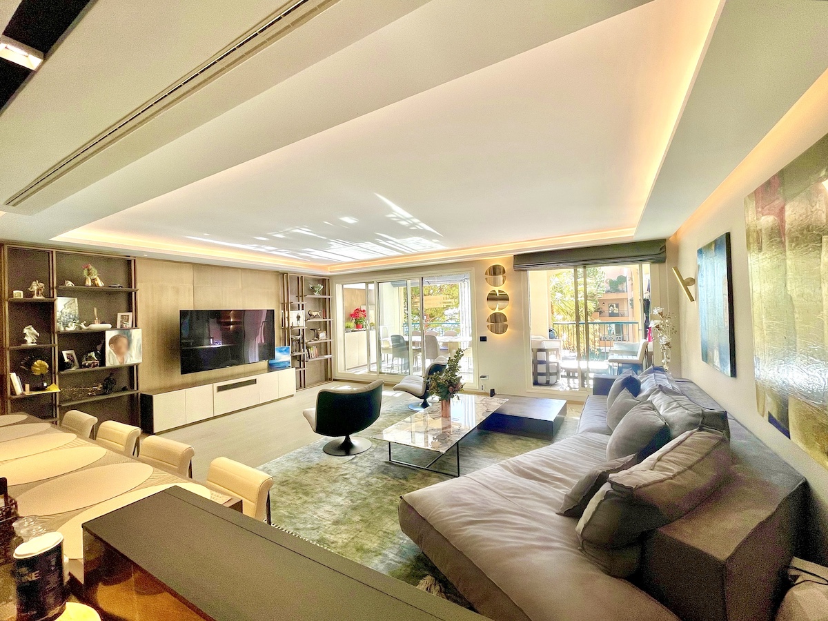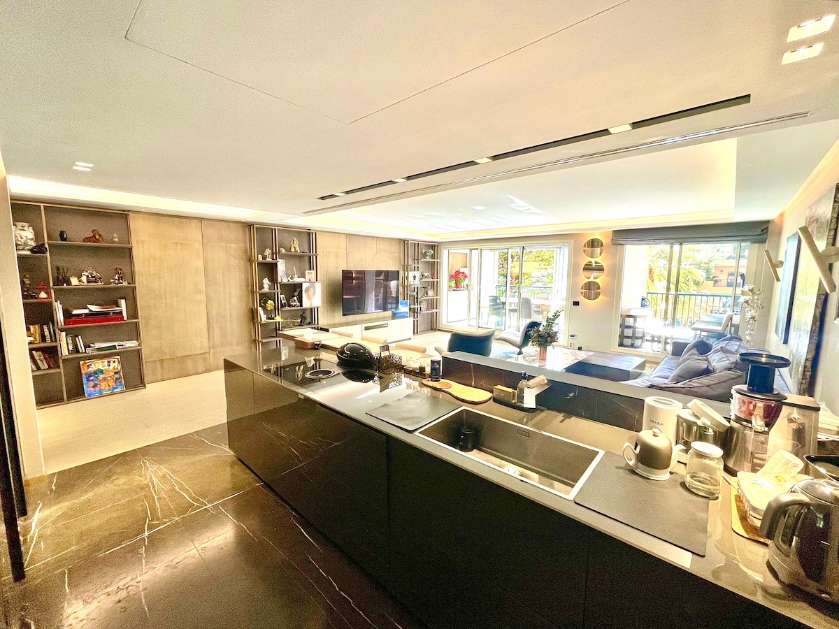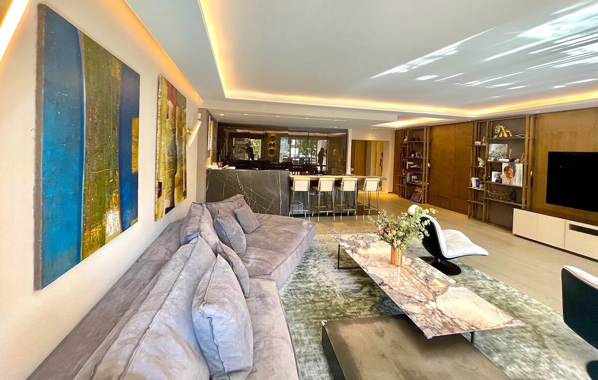 The apartment is south facing and benefits from beautiful light and the fresh sea air. The whole property has been completely and beautifully renovated in elegant, contemporary style and in very good taste. No detail has been overlooked and every part of this splendid home has been created with the finest materials, such as rare marble and natural wood floors. The interior is contemporary, with spacious rooms and superb, closed terraces.The property includes a wide entrance hall that leads to a living room with an open-plan, fully equipped kitchen. The master bedroom is spacious and includes a small office overlooking palm gardens and the sea. There are 2 additional en-suite bedrooms, all with generous, built-in storage and an office/4th bedroom with a large walk-in closet. All rooms feature well-appointed furniture, tailor-made cupboards and wardrobes lined with leather and other custom-made finishes. The property also includes a laundry room and it is fully air-conditioned.