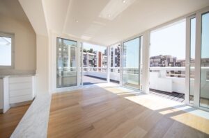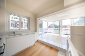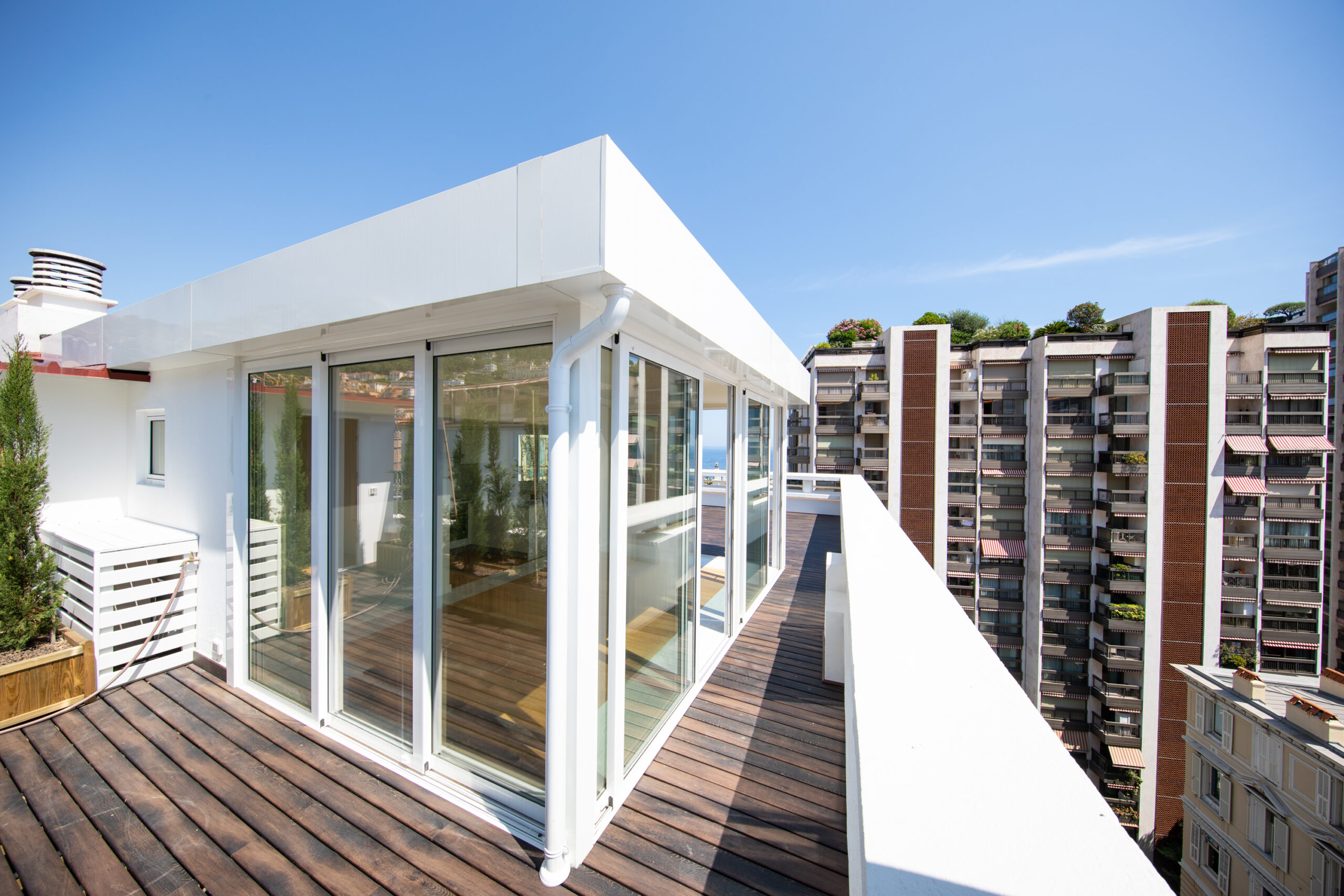 Cool and hip Scandinavian-style duplex penthouse offering a 180 degree view and an exceptionally large wooden deck roof terrace in the centre of town. The property is situated in a superb position on Boulevard Princess Charlotte and occupies the top 2 floors of a good building.  The living area consists of a spacious ensuite master bedroom, a second bedroom, a bathroom and large open-plan living area. The rooftop terrace occupies the entire roof and is bathed in sunlight, with sea views.  The property has been beautifully and newly renovated and is in immaculate condition.